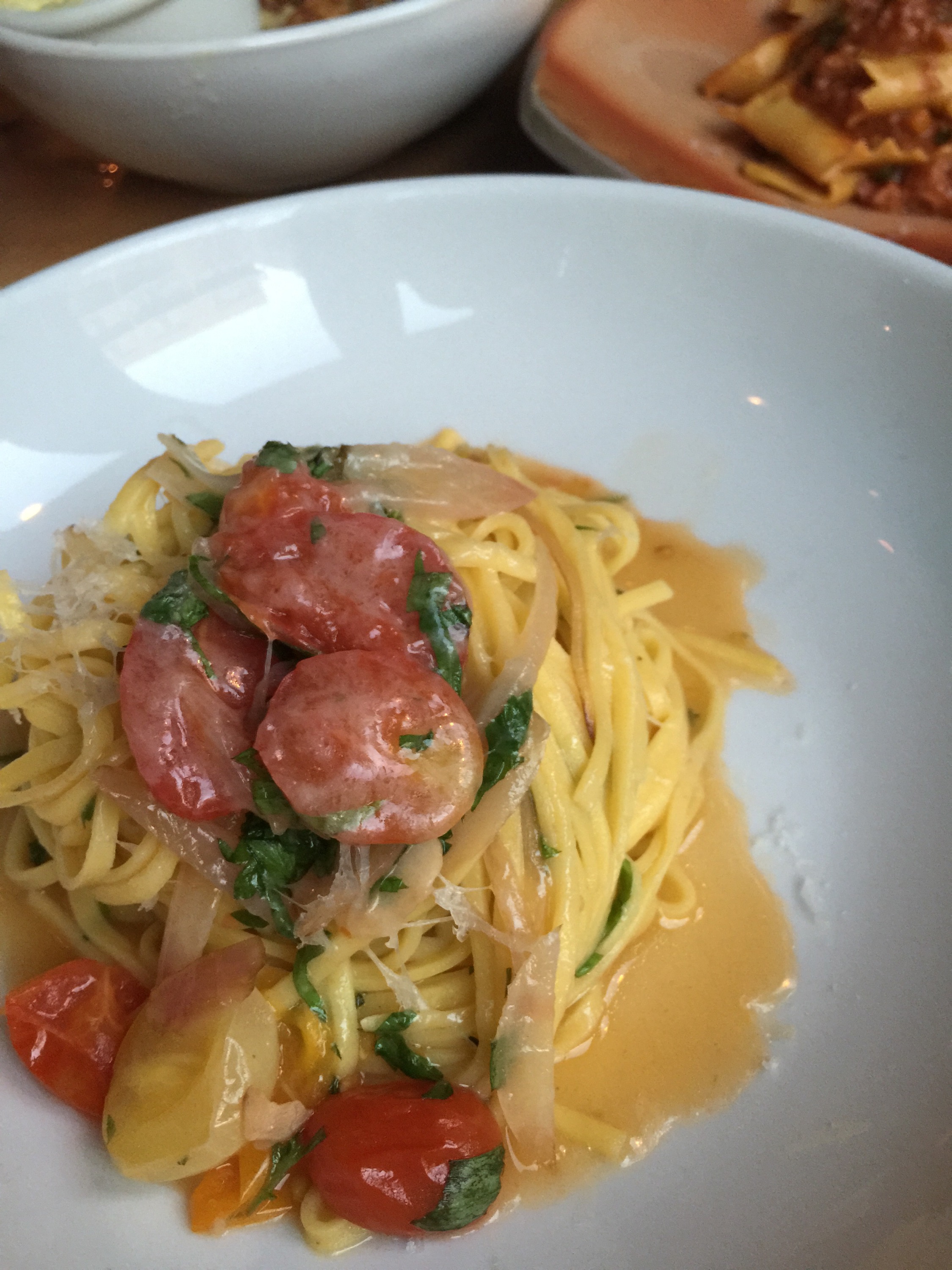 Capellini, perfectly cooked, with roasted garlic, Nichols Farm cherry tomatoes and grana padano.